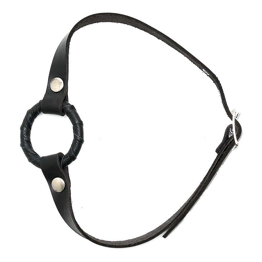 Genuine leather mouth gag with ring. The metal ring is covered with Nappa leather and has an inner diameter of 37 mm and an outer diameter of 52 mm. This gag is adjustable over 7 positions and closes at the back with a metal buckle.