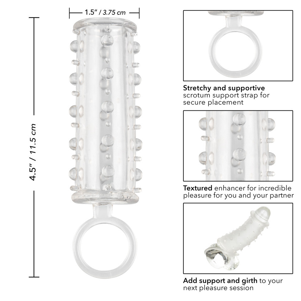 The Sensation Enhancer is a super tight, open-end extension sleeve with a sensually beaded shaft. The super-sized enhancer wraps tight around your pleasure tool to increase girth, length and pleasure.
