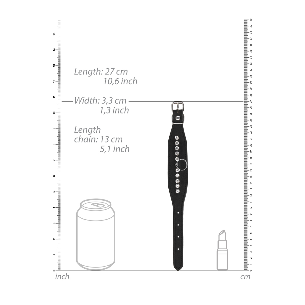Get ready to please or receive in the intense Diamond BDSM line. Glamorously tough, the perfect combination of firm (faux) leather and glamourous diamond studs will turn you into the star attraction of the night.