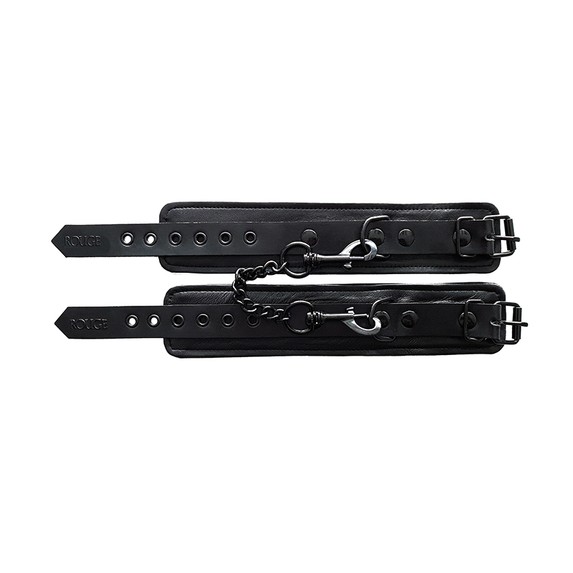 An exquisite pair of leather ankle cuffs. Fully adjustable buckle straps. Comes with a detachable double-trigger hook chain connecting to a D-Ring. All black with black Accessories
